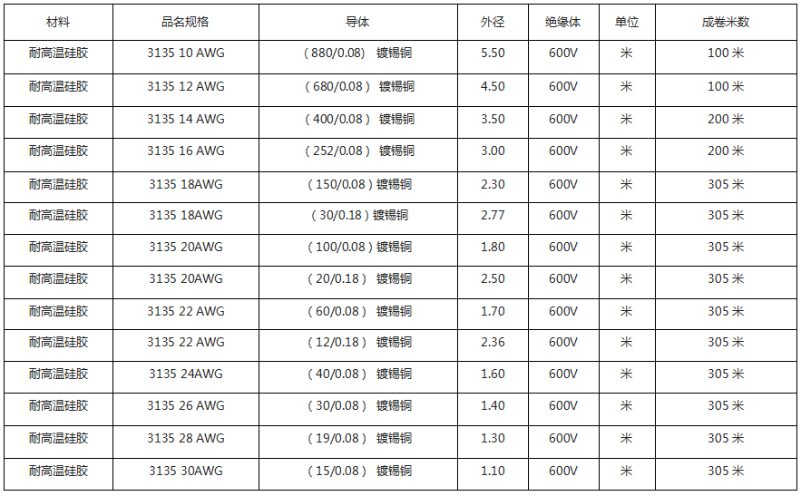 產(chǎn)品名稱:UL 3135 硅膠電線用于交流額定電壓0.6/1KV及以下固定敷設(shè)用動(dòng)力傳輸線或移動(dòng)電器用連接電纜,產(chǎn)品具有耐熱輻射、耐寒、耐酸堿及腐蝕性氣體、防水等特性 一.技術(shù)參數(shù) 技術(shù)標(biāo)準(zhǔn):UL758、UL1581及CSA C22.2 NO.210.2.相關(guān)技術(shù)標(biāo)準(zhǔn) 額定電壓:600V 溫度范圍:﹣60℃-﹢200℃ 導(dǎo)體類型:鍍錫銅絲 絕緣材料:硅橡膠 外徑公差:0.1mm 產(chǎn)品演示:紅/藍(lán)/黑/白/綠/黃等等 二.產(chǎn)品用途 廣泛應(yīng)用于LED、照明燈具、電路板、電子電器、醫(yī)療設(shè)備、機(jī)械設(shè)備、新能源設(shè)備、軍工航空領(lǐng)域等高溫場(chǎng)所的絕緣導(dǎo)線。 三.詳細(xì)規(guī)格 ![]() 我司擁有先進(jìn)的電子線壓出機(jī),并已經(jīng)取得相關(guān)的UL認(rèn)證、環(huán)保認(rèn)證,不同規(guī)格的線材,皆可按需定做,歡迎各位客戶來(lái)圖定制、來(lái)樣做貨,我司提供免費(fèi)打樣。 |