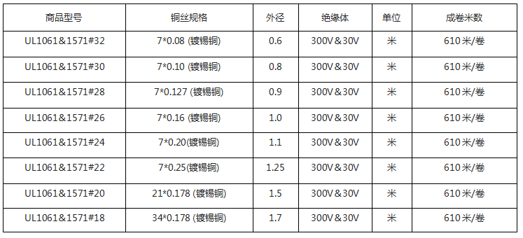 產(chǎn)品名稱:UL 1061&1571 用于電子、電器設(shè)備內(nèi)部連接 一.技術(shù)參數(shù) 技術(shù)標(biāo)準(zhǔn):可通過UL Vw-1垂直型耐燃測(cè)試 額定電壓:300V&30V 額定溫度:80℃ 導(dǎo)體類型:鍍錫銅絲 絕緣材料:PVC 產(chǎn)品顏色:紅/藍(lán)/黑/白/綠/黃等等 二.產(chǎn)品用途: 電子設(shè)備二次回路中內(nèi)部連接用線 三.詳細(xì)規(guī)格 ![]() 我司擁有先進(jìn)的電子線壓出機(jī),并已經(jīng)取得相關(guān)的UL認(rèn)證、環(huán)保認(rèn)證,不同規(guī)格的線材,皆可按需定做,歡迎各位客戶來圖定制、來樣做貨,我司提供免費(fèi)打樣。 |